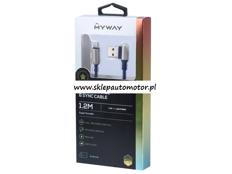 KABEL DO ŁADOWANIA I SYNCHRONIZACJI 120CM W OPLOCIE Z MIKROFIBRY DWUSTRONNE KĄTOWE USB - APPLE IPHONE NAVY MYWAY