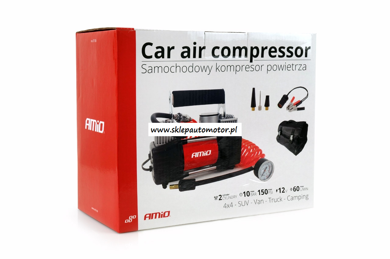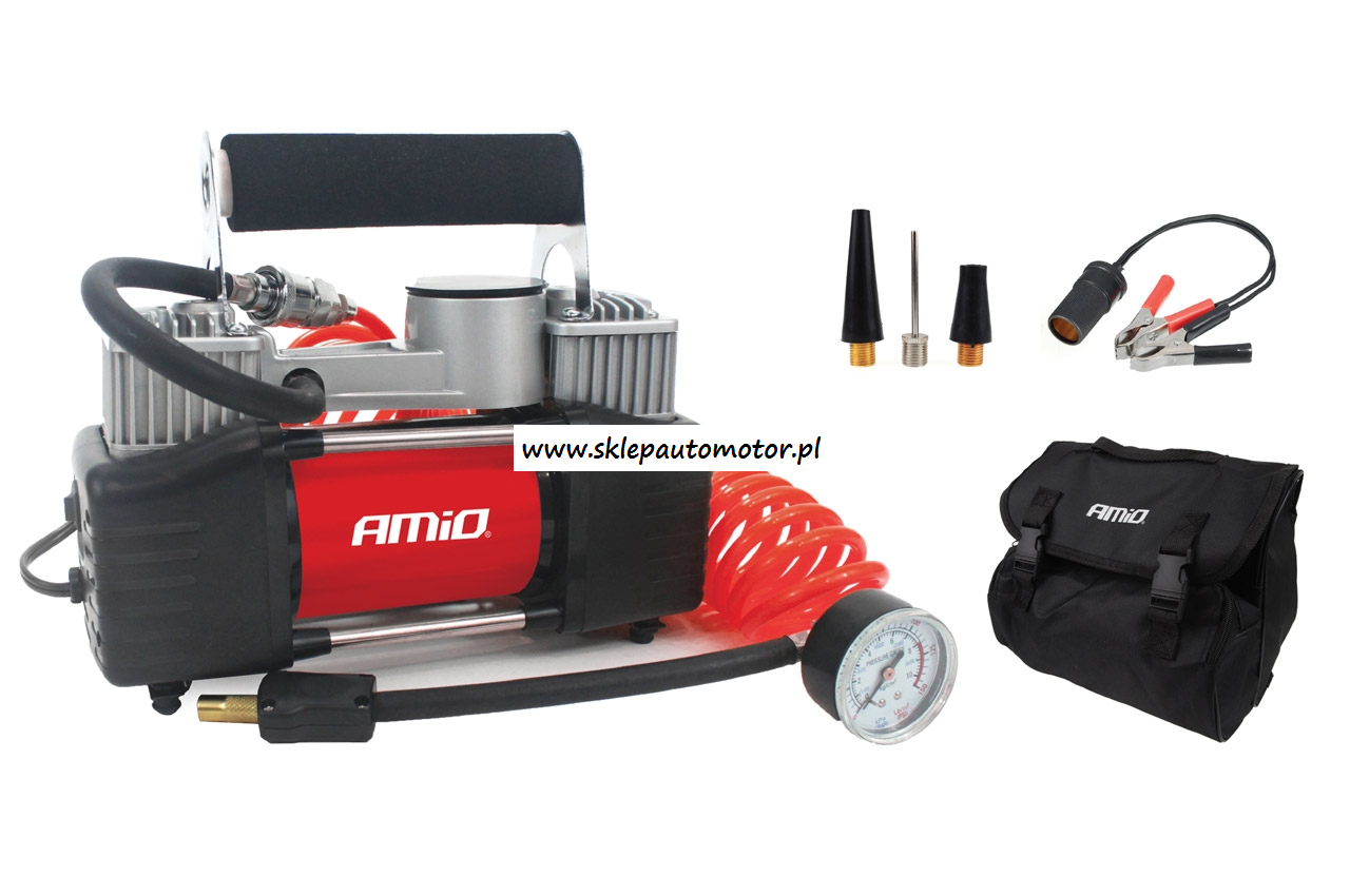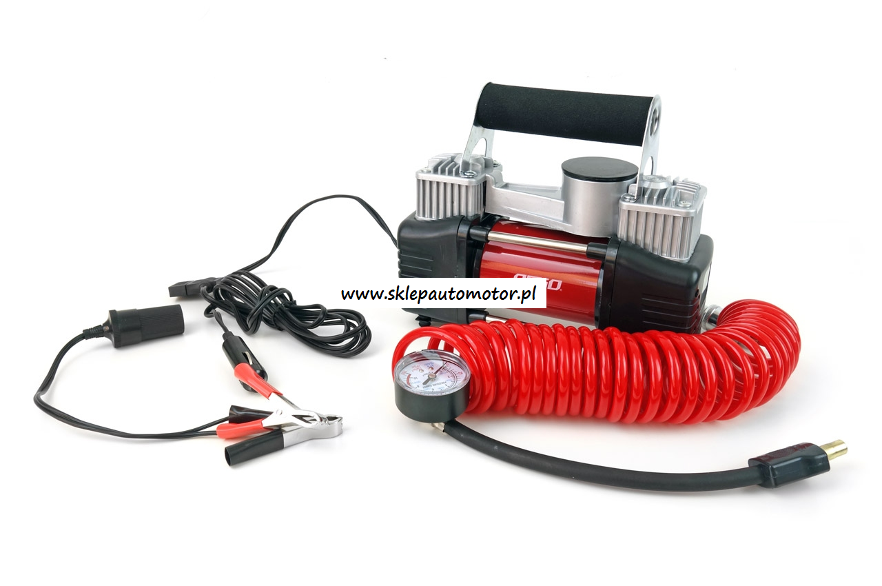 Mocny, metalowy kompresor dwu tłowkowy z manometrem. Kompresor przeznaczony jest w do pompowania kół, piłek, pontonów, basenów i innych, dzięki trzem różnym końcówkom do wentyli w zestawie. Daje sobie radę z dużymi kołami samochodów 4x4 - SUV - Van - Truck - Camping