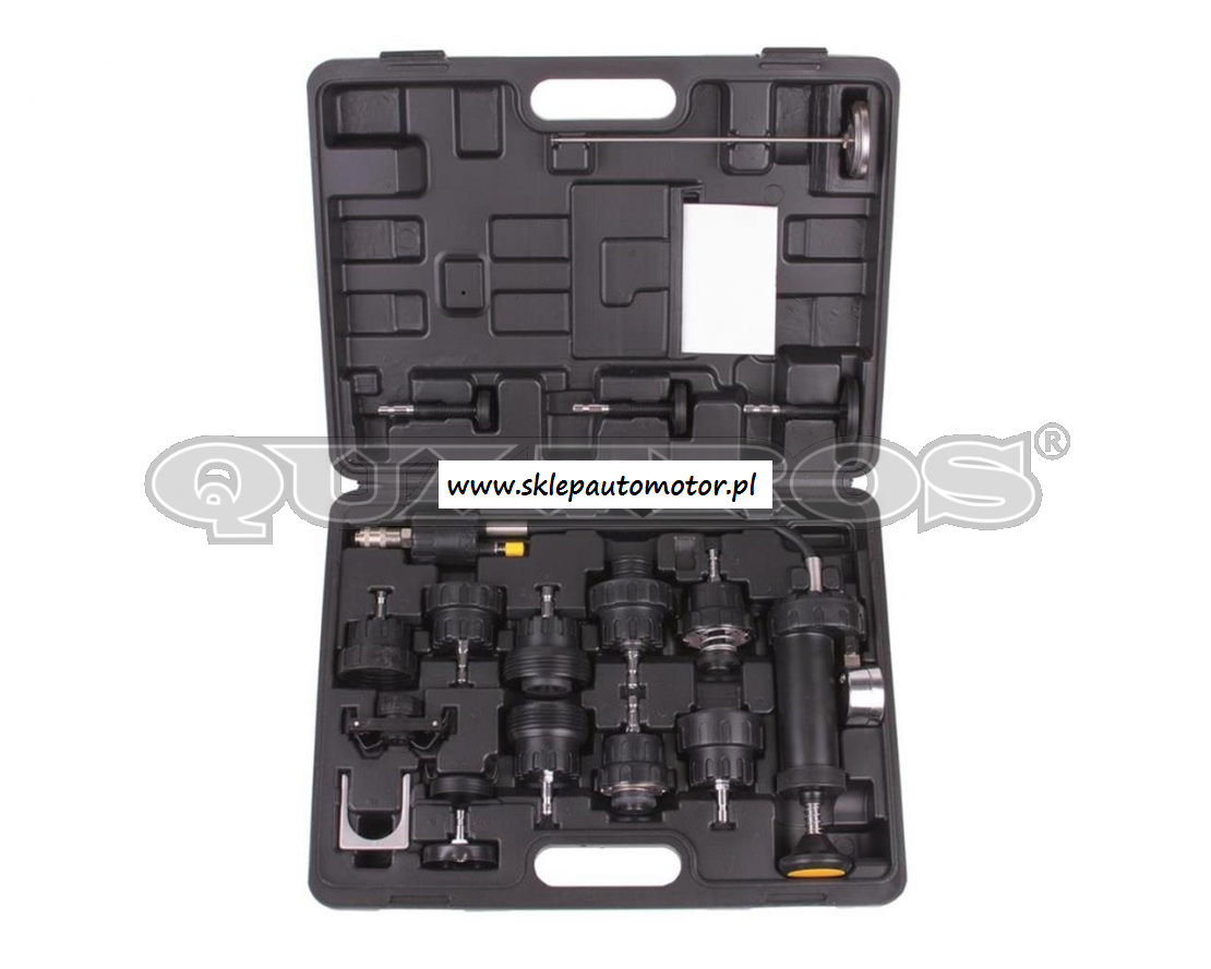 Przyrząd pozwala na łatwe i szybkie sprawdzenie szczelności układu chłodzenia. Zestaw zawiera korki i adaptery do wielu różnych marek samochodów. Test szczelności polega na dobraniu odpowiedniego adaptera, następnie za pomocą pompki wytworzenia ciśnienia ok. 30PSI i obserwowaniu wskazań manometru przez ok. 2-3min. W tym czasie wartość ciśnienia powinna utrzymywać się na tym samym poziomie.