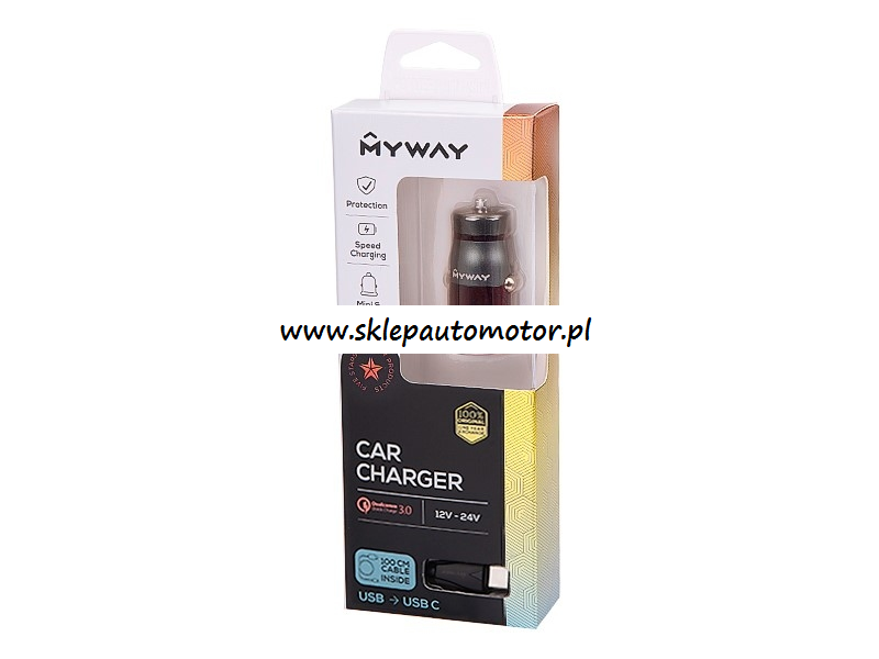 ŁADOWARKA SAMOCHODOWA 12/24V QC3.0 1 * USB + KABEL Z WTYCZKĄ USB-C MYWAY