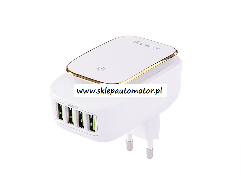 Ładowarka sieciowa z 4 gniazdami USB-A. Łączna moc gniazd USB wynosi 4.4A z funkcją Auto-ID - automatycznie identyfikują baterię urządzenia dostosowując odpowiednio moc ładowania.