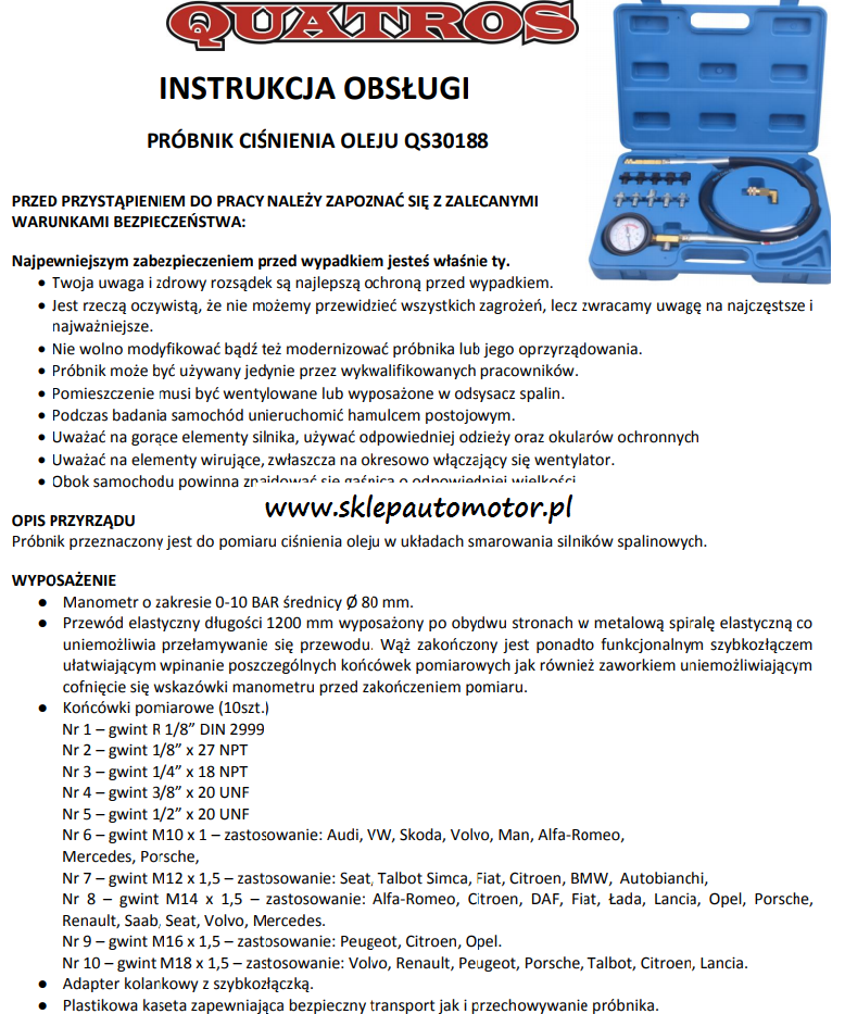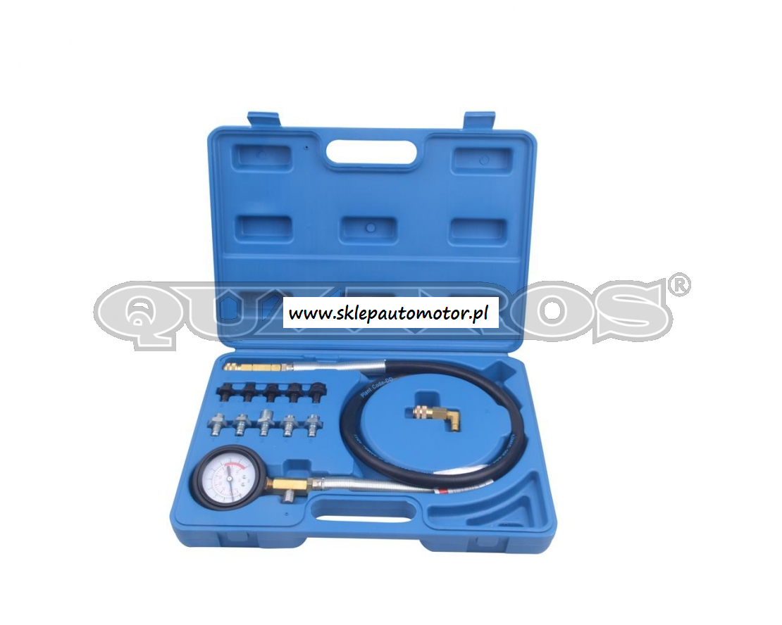 Zawartość zestawu: Manometr o zakresie 0-10BAR z przewodem elastycznym L=1200mm 10szt. adapterów pomiarowych Adapter kolankowy z szybkozłączem