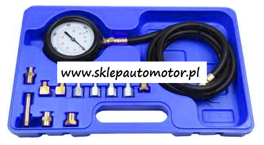 Zawartość zestawu: Manometr z zakresem 0-28bar (0-400PSI) z przewodem gumowym L=600mm Kpl. adapterów przyłączeniowych