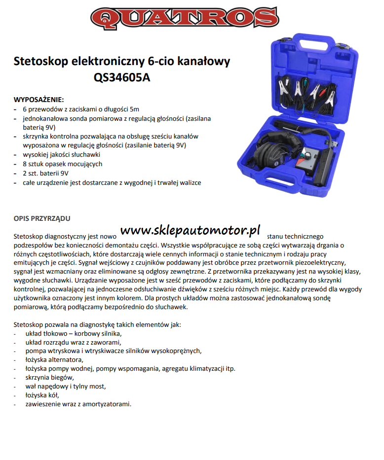 Stetoskop diagnostyczny jest urządzeniem pozwalającym na określenie stanu technicznego podzespołów bez konieczności demontażu części. Wszystkie współpracujące ze sobą części wytwarzają drgania o różnych częstotliwościach, które dostarczają wiele cennych informacji o stanie technicznym i rodzaju pracy emitujących je części. Sygnał wejściowy z czujników poddawany jest obróbce przez przetwornik piezoelektryczny, sygnał jest wzmacniany oraz eliminowane są odgłosy zewnętrzne. Z przetwornika przekazywany jest na wysokiej klasy, wygodne słuchawki. Urządzanie wyposażone jest w sześć przewodów z zaciskami, które podłączamy do skrzynki kontrolnej, pozwalającej na jednoczesne odsłuchiwanie dźwięków z sześciu różnych miejsc. Każdy przewód dla wygody użytkownika oznaczony jest innym kolorem. Dla prostych układów można zastosować jednokanałową sondę pomiarową, którą podłączamy bezpośrednio do słuchawek.