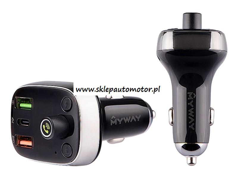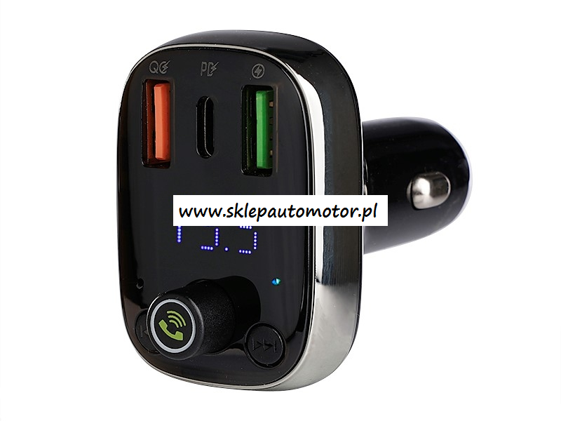 Transmiter FM z funkcją Bluetooth HandsFree oraz 3 gniazdami do ładowania urządzeń. Uniwersalny dla pojazdów 12/24V. Ładowarka. Gniazdo USB-A z funkcją Auto-ID,która automatycznie identyfikuje baterię urządzenia dostosowując odpowiednio moc ładowania. Gniazdo USB-C wspiera szybkie ładowanie Power Delivery (PD). Gniazdu USB-A z funkcją Quick Charge 4.0+ (QC4.0+), która umożliwia bardzo szybkie ładowanie baterii urządzeń wspierających tą technologię. Transmiter FM i Bluetooth HandsFree. Obsługuje transmisję bezprzewodową Bluetooth 5.0 A2DP z możliwością podłączenia 2 telefonów, spełnia funkcję zestawu głośnomówiącego - posiada wbudowany mikrofon, a dźwięk przenosi do głośników pojazdu za pośrednictwem transmisji FM, wspiera także karty TF i napędy USB. Woltomierz posiada wyświetlacz pokazujący aktualny stan akumulatora pojazdu.