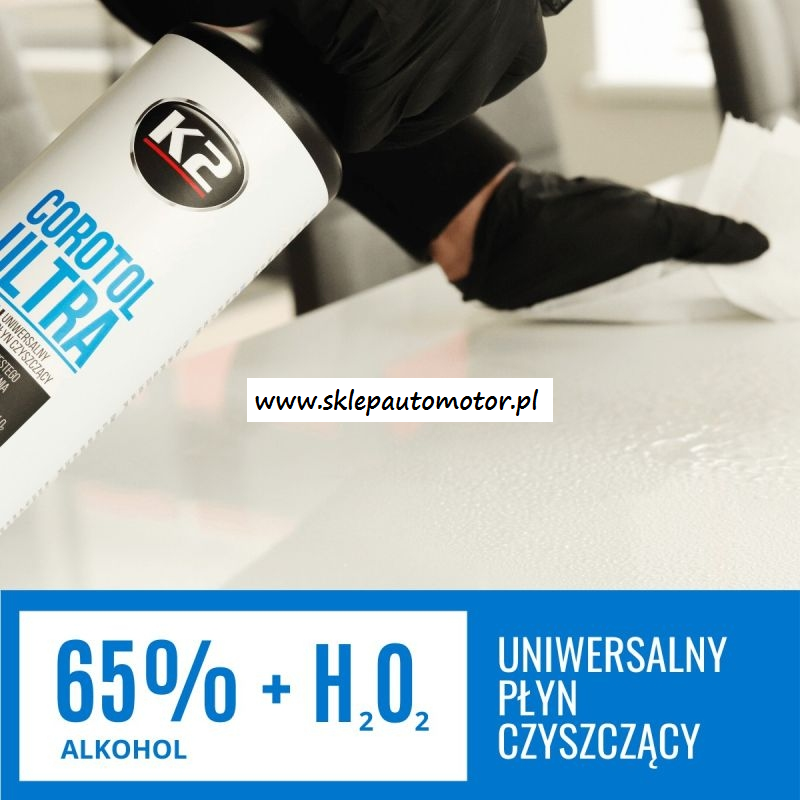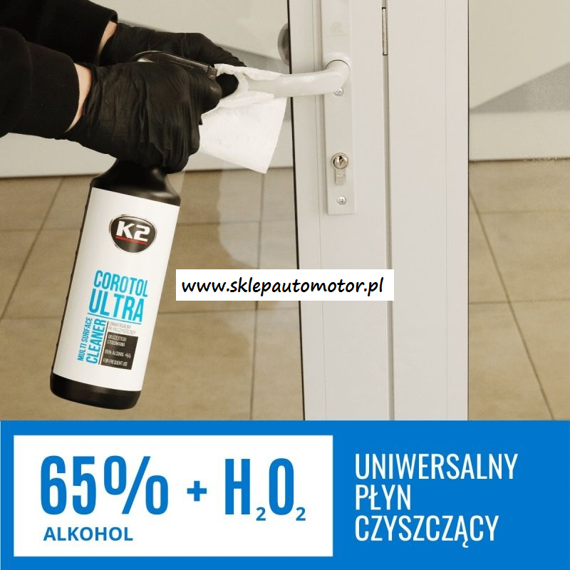 K2 COROTOL ULTRA to skuteczny płyn myjący zawierający w swoim składzie aż 65% alkoholu etylowego wzmocnionego nadtlenkiem wodoru z dodatkiem specjalnych składników przeciwdziałających wysuszaniu rąk. Jest przeznaczony do czyszczenia powierzchni metalowych, laminowanych, szklanych, ceramicznych, klamek,  poręczy,  uchwytów,  urządzeń  biurowych,  telefonów  komórkowych,  terminali  płatniczych  itp  itd.  Jest polecany do systematycznego stosowania w celu eliminacji niebezpiecznych zabrudzeń.