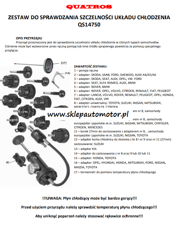 Przyrząd pozwala na łatwe i szybkie sprawdzenie szczelności układu chłodzenia. Zestaw zawiera korki i adaptery do wielu różnych marek samochodów. Test szczelności polega na dobraniu odpowiedniego adaptera, następnie za pomocą pompki wytworzenia ciśnienia ok. 30PSI i obserwowaniu wskazań manometru przez ok. 2-3min. W tym czasie wartość ciśnienia powinna utrzymywać się na tym samym poziomie.