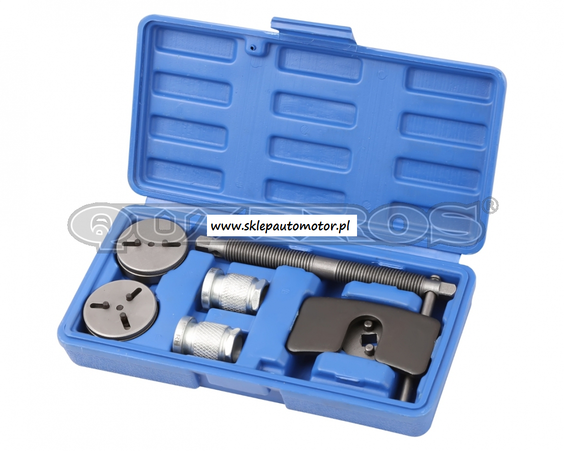 Uniwersalny przyrząd do cofania tłoczka hamulcowego podczas wymiany klocków hamulcowych. Zestaw zawiera dwa adaptery dwa- i trzy pin, z regulowanym rozstawem oraz uniwersalną prasę z możliwością pracy w dwóch kierunkach: w prawo i w lewo.