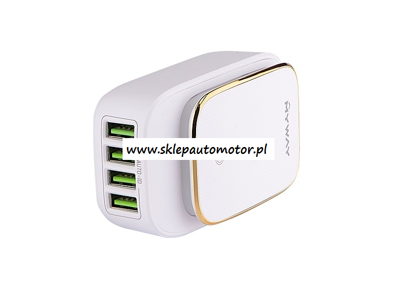 Ładowarka sieciowa z 4 gniazdami USB-A. Łączna moc gniazd USB wynosi 4.4A z funkcją Auto-ID - automatycznie identyfikują baterię urządzenia dostosowując odpowiednio moc ładowania.