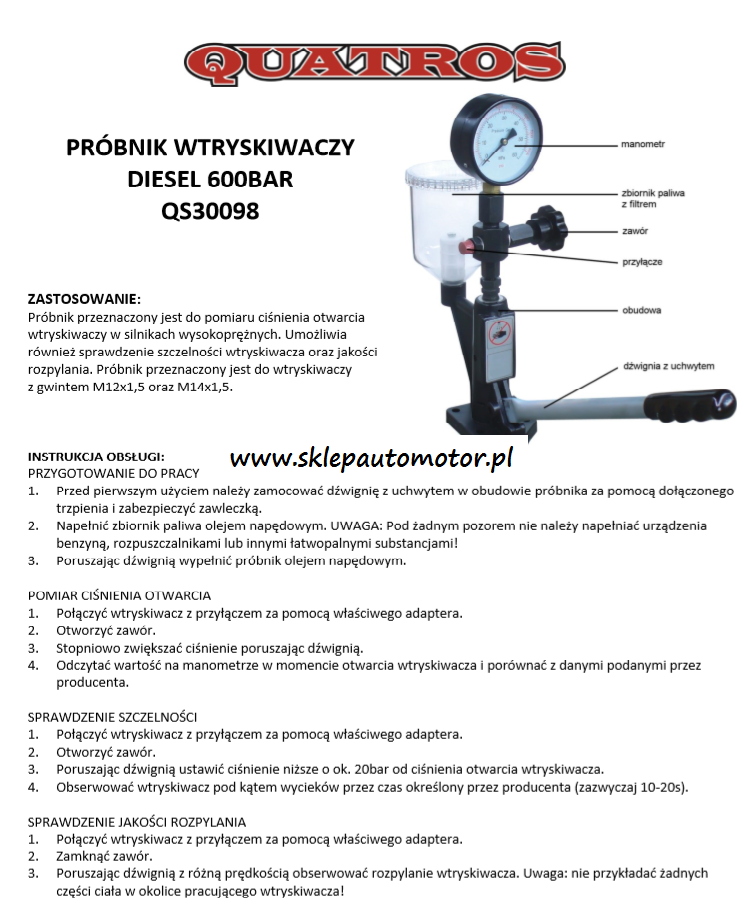 Umożliwia również sprawdzenie szczelności wtryskiwacza oraz jakości rozpylania.