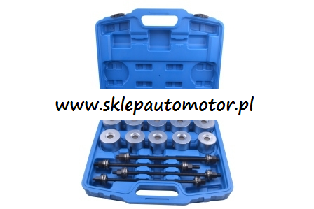 • Do montażu i demontażu łożysk, tulei metalowo – gumowych, pierścieni uszczelniających itp. • Uniwersalne zastosowanie • Zawartość zestawu: 20szt. tulei w rozmiarach: Øwewn. od 34mm do 72mm, Øzewn. od 44mm do 82mm 4szt. stopniowane dyski 4szt. łożyskowane śruby z nakrętkami w rozmiarach: M10, M12, M14, M16