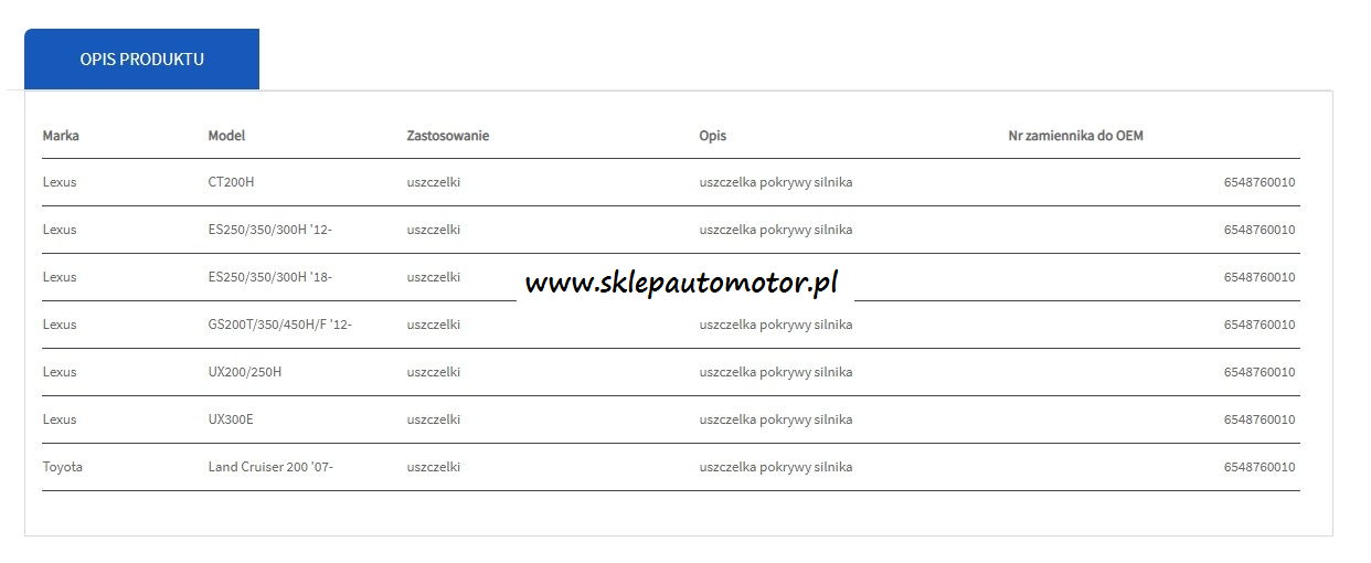 SPINKA USZCZELKI POKRYWY SILNIKA LEXUS 6548760010