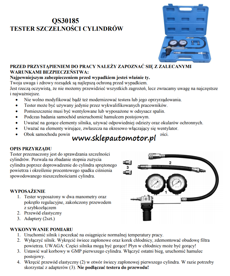 Pozwala na zbadanie stopnia zużycia silnika poprzez doprowadzenie do cylindra sprężonego powietrza i określenie procentowego spadku ciśnienia spowodowanego nieszczelnościami cylindra.