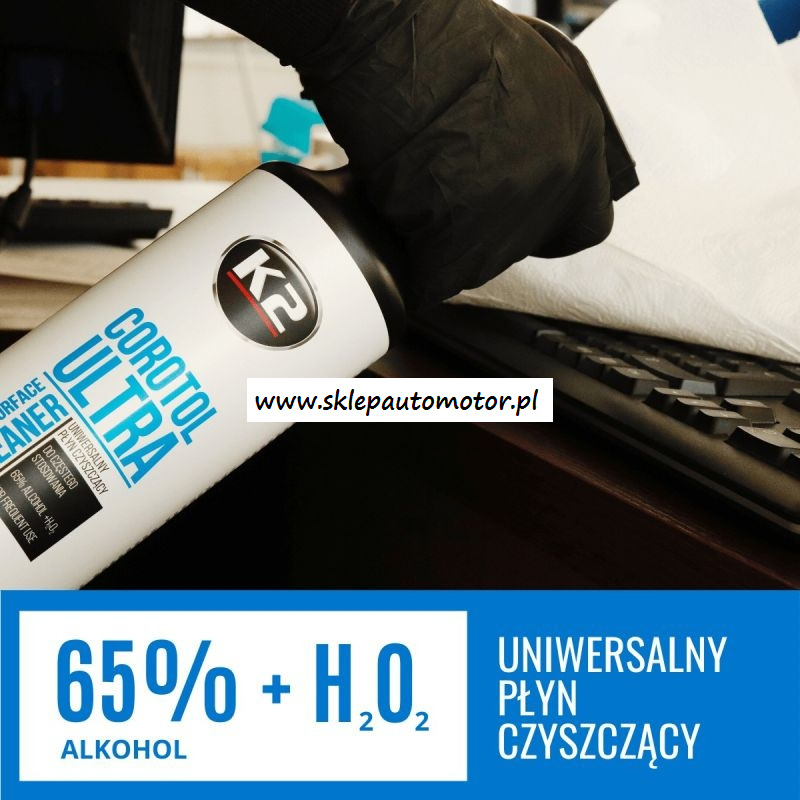 K2 COROTOL ULTRA to skuteczny płyn myjący zawierający w swoim składzie aż 65% alkoholu etylowego wzmocnionego nadtlenkiem wodoru z dodatkiem specjalnych składników przeciwdziałających wysuszaniu rąk. Jest przeznaczony do czyszczenia powierzchni metalowych, laminowanych, szklanych, ceramicznych, klamek,  poręczy,  uchwytów,  urządzeń  biurowych,  telefonów  komórkowych,  terminali  płatniczych  itp  itd.  Jest polecany do systematycznego stosowania w celu eliminacji niebezpiecznych zabrudzeń.